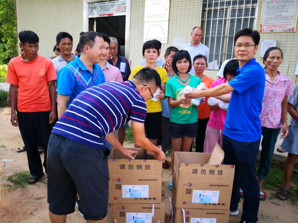 农村科技特派员在贫困村发放动物疫病治疗药物与消毒药