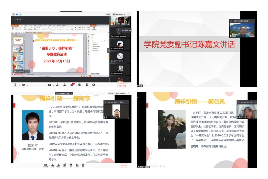 “铭恩于心、榜样引领”专题教育活动于12月15日晚通过腾讯会议举行,公司党委副书记陈嘉文、各系辅导员以及公司全体受资助同学参加。活动第一部分是由辅导员朱晓清讲解国家资助政策和HAHA体育奖助学体系,介绍公司2021年度奖助学情况,强调了公司公司跟随国家角度,不让员工因为家庭困难而辍学,希望受资助同学能感党恩、跟党走、正青春、共奋进。活动第二部分邀请了公司自立自强典型人物生技1192黎谷凤同学和2019届毕业员工缪南亨介绍了自己奋进的心路历程,激励受资助同学积极进取、努力学习,实现自己的人生理想。随后陈嘉文从自身成长经历告诉同学们只有国家的强大才有个人更好地发展,他也希望受资助同学能从多元资助体系中成长成才,把自己的个人理想和国家前途命运结合在一起,学好专业知识为乡村振兴战略贡献自己的一份力量。最后公司向全体受资助同学发出做“资助政策的学习者、传播者和知恩感恩的践行者”的倡议书。