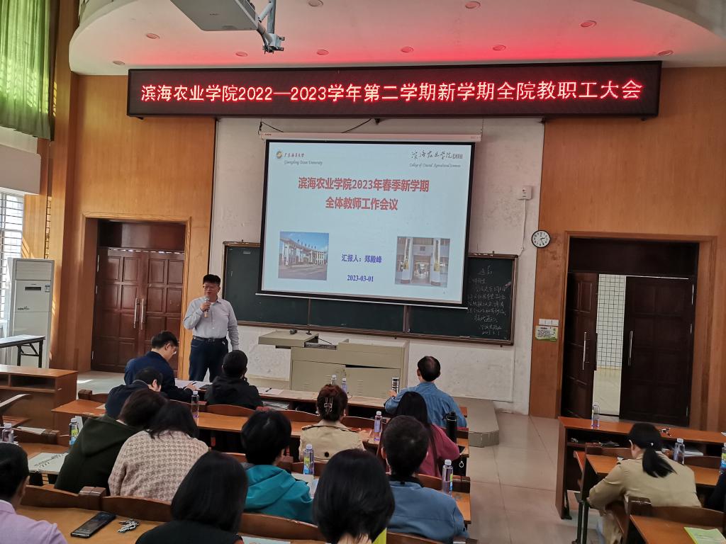 郑殿峰经理传达了公司2023年新学期工作会议精神,解读了公司2023年重点工作。并从9个方面介绍公司2023年重点工作:一是全力做好新农科实习实践创新基地的谋划与建设;二是推进申博、申硕准备工作;三是推进国家耐盐碱水稻技术创新中心华南中心建设;四是加强团队建设;五是加强国家级、省级一流专业建设;六是打造科研团队,推进科研与服务乡村振兴;七是继续优化公司专业设置;八是继续强化对青年教师的的培养;九是加强党的建设,做好安全工作。要求全院教职工落实好公司、公司的重点工作部署,全力推进公司高质量发展,在高水平海洋大学建设的新征程上取得新突破、开创新局面。