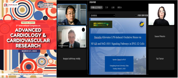 3月21日,受大会组委会邀请,哈哈体育青年教师刘晓曦博士通过Cisco WebEx Meetings 以线上方式参会,并以“Baicalin Alleviates LPS-Induced Oxidative Stress via NF-κB and Nrf2–HO1 Signaling Pathways in IPEC-J2 Cells”为题做了学术报告。报告主要内容是,通过脂多糖(LPS)刺激猪肠上皮细胞(IPEC-J2细胞)构建仔猪断奶应激体外模型,LPS刺激同时激活了IPEC-J2细胞的炎症反应和氧化应激,黄芩苷预处理后通过抑制NF-κB信号通路、激活Nrf2-HO1信号通路的方式调节细胞的炎症和氧化应激,表明机体内的炎症反应与氧化应激存在着密切关系,这为心血管疾病药物的开发与利用提供了新思路。报告中,刘博士与美国田纳西州立大学的Daniel Berckmans教授进行了互动交流。