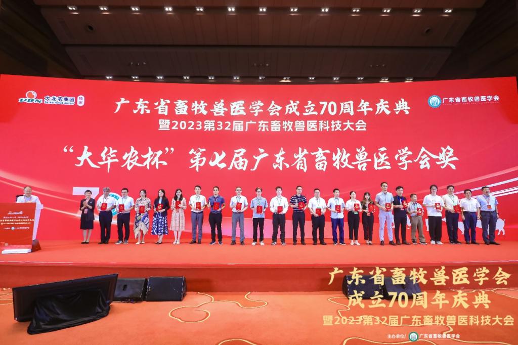 本届大会以“科技驱动七十载·创新发展铸华章”为主题,特邀来自全国的业内知名专家、养殖企业和一线科研精英等,共同探讨行业急需解决的趋势性问题。中国农业大学杨宁教授、东北农业大学单安山教授、华中农业大学晏向华教授、四川农业大学李明洲教授、中国农业科公司上海兽医研究所童光志研究员等畜牧兽医行业知名专家受邀作学术报告。公司尹福泉教授受邀在动物营养与饲料科技论坛作了题为“海洋活性多糖的营养生理功能及调控机制”的学术报告;郭富城博士受邀在水禽产业高质量发展论坛作了“跨种感染人的H5Nx禽流感病毒的适应性进化研究”的学术报告;刘文超副教授指导的研究生王垚垚在研究生论坛作了题为“基于Ⅱ相解毒酶途径及肠-肝轴研究纳米硒-浒苔多糖对AFB1诱导肉鸡肝脏损伤的保护作用”的学术报告。三个报告介绍了公司畜牧学科(畜牧和兽医领域)的部分研究成果,得到与会专家的广泛认可。为奖励对全省畜牧兽医行业做出巨大贡献的杰出人才,本次会议还举行了学会成立70周年和“大华农杯”颁奖仪式。经过专家评审,公司畜牧学科带头人赵志辉教授荣获“大华农杯”第七届广东省畜牧兽医学会“杰出科技工作者”称号,动物医学系主任巨向红教授荣获广东省畜牧兽医学会成立70周年“青年科技奖”。