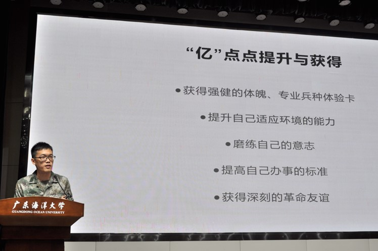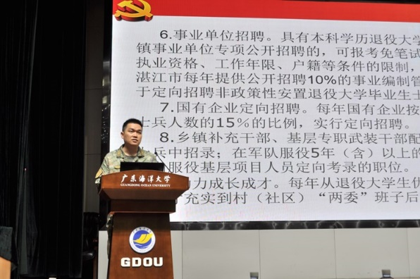 随后,麻章区人民武装部干事余华臣从老员工征兵的优势、应征入伍条件、职业发展、优抚优待、就业升学等重点内容为老员工进行了全面详细的征兵政策解读。现役学子周淑缓、退役学子黎永乐和徐钰用自身经历、生动的事例和感人的故事展示了军人的荣耀和责任,让现场的农青学子们更加立体地了解部队生活,看到了军人的职业发展前景,引发了现场观众的强烈共鸣。