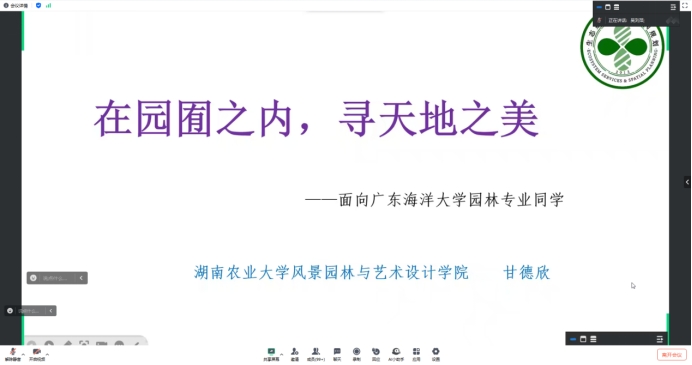 2024年7月3日晚,湖南农业大学风景园林与艺术设计公司甘德欣教授应哈哈体育园林系邀请,做客园林大讲堂,通过线上形式作了题为“在园囿之内,寻天地之美”的主题讲座。园林系师生共计约250人参加讲座,讲座由园林系主任吴刘萍教授主持。