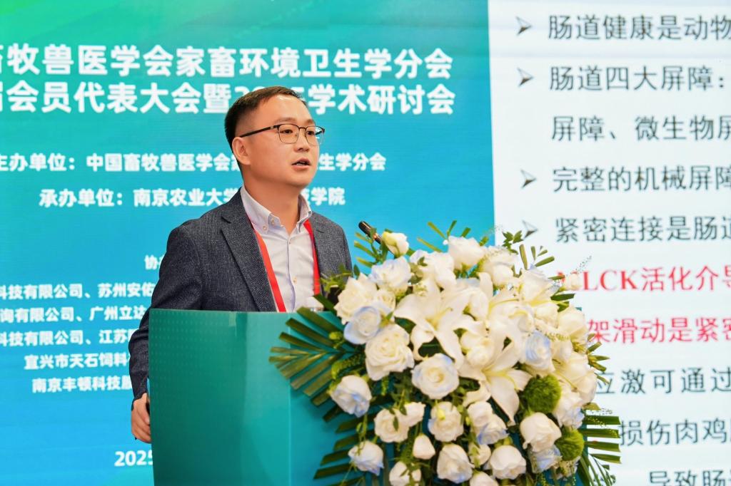 本次大会邀请了中国农业科公司北京畜牧兽医研究所熊本海研究员、南京农业大学朱伟云教授和赵茹茜教授、山东农业大学林海教授等专家做大会主旨报告,中国农业大学吴中红教授、浙江大学汪开英教授等25位专家做大会报告。刘文超受邀作了题为《褐藻寡糖通过AKK菌改善热应激肉鸡肠道机械屏障功能》的大会报告,详细介绍了公司畜牧学科历史沿革、发展现状,以及团队在海洋活性物质饲料化利用及肉鸡环境应激营养调控领域的最新研究进展。
