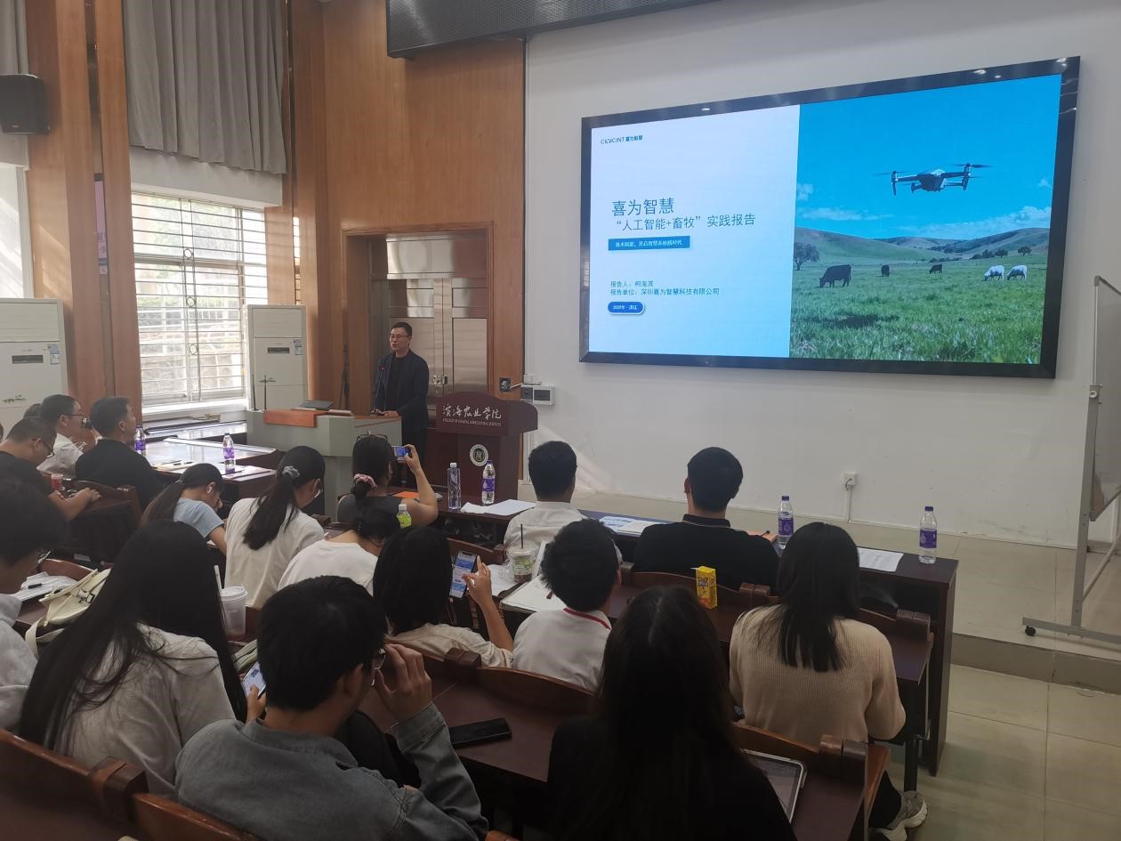 深圳喜为智慧科技有限公司创始人兼首席执行官柯海滨带来《喜为“人工智能+畜牧”实践》报告,以AI监测畜禽健康、智能投喂调度等实际案例,阐释了“人工智能+畜牧”如何实现养殖效率提升与成本优化,展现了当前养殖业智能化变革的行业趋势,为学子们揭示了跨学科技术融合的广阔前景。